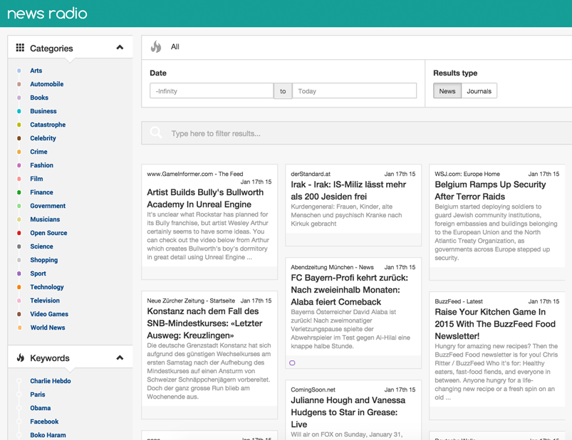 News Radio shows modern Search technology used for soft-realtime news aggregation combined with automatic keyword extraction, light-weight onthology and facetting.